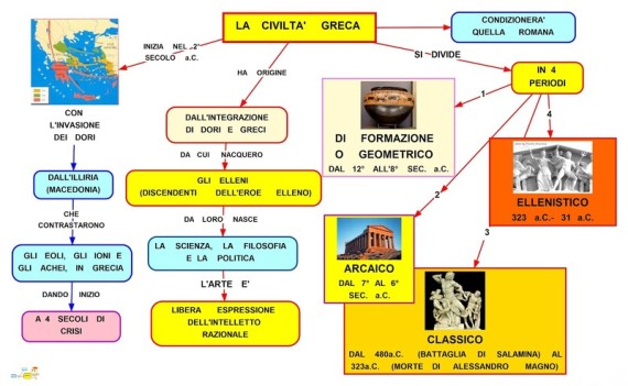 Ordine dorico - Maestoso e solenne.La colonna, liscia o scanalata (circa 20 scanalature) a spigolo vivo, ha un rigonfiamento detto èntasi a circa 1/3 dell'altezza, poggia direttamente sullo stilobate e termina con un capitello composto da due parti: l'echino (circolare) e l'abaco (quadrato). La trabeazione è liscia, con decorazioni a metope e triglifi. La copertura con due spioventi crea uno spazio triangolare detto timpano decorato spesso con scene mitologiche.